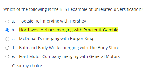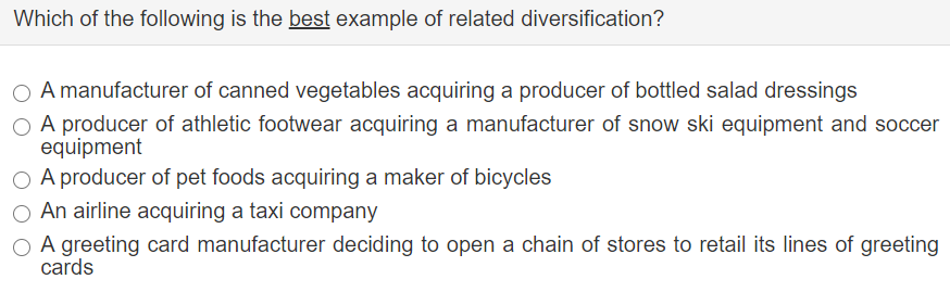 A manufacturer of snack foods diversifying into fast-food. For example a phone company that adds or expands its wireless products and services by purchasing another wireless company is engaging in related diversification. A beer brewer acquiring a maker of aluminum cans b. Which of the following is the best example of related diversification. Diversification is the art of entering product markets different from those in which the firm is currently engaged in. An airline firm acquiring a rent-a-car company B. For example if the owner of a trade company is competent in the field of computer design they can open an internet store to sell goods and also expand activity by adding web page design services etc.