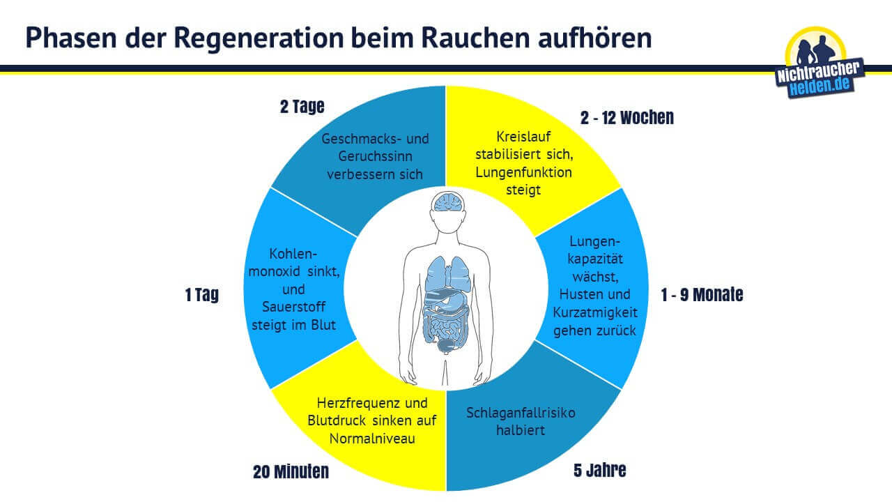 Das beginnt bereits kurz nach der letzten Zigarette. Das Risiko eine Infektion zu. Puls und Blutdruck sinken Nach einem Tag.